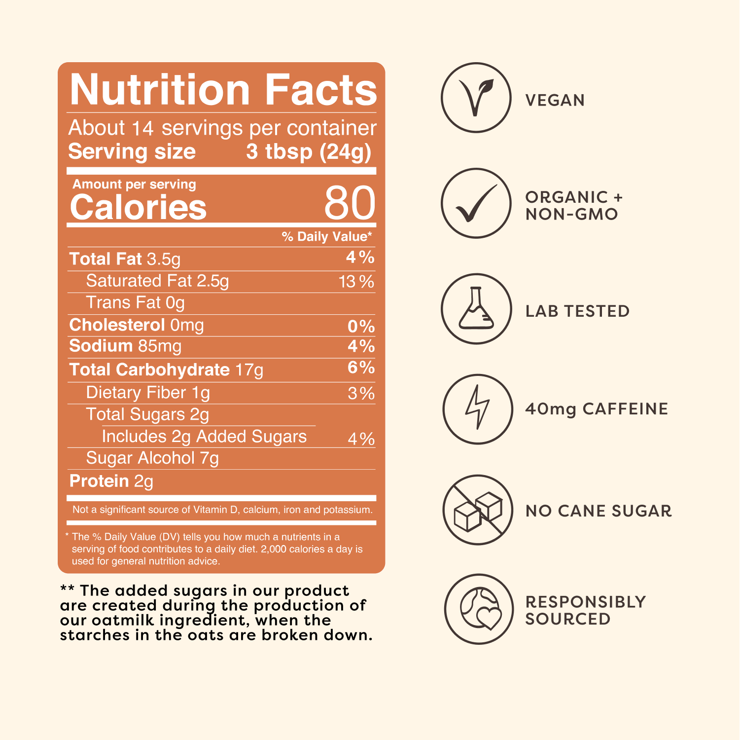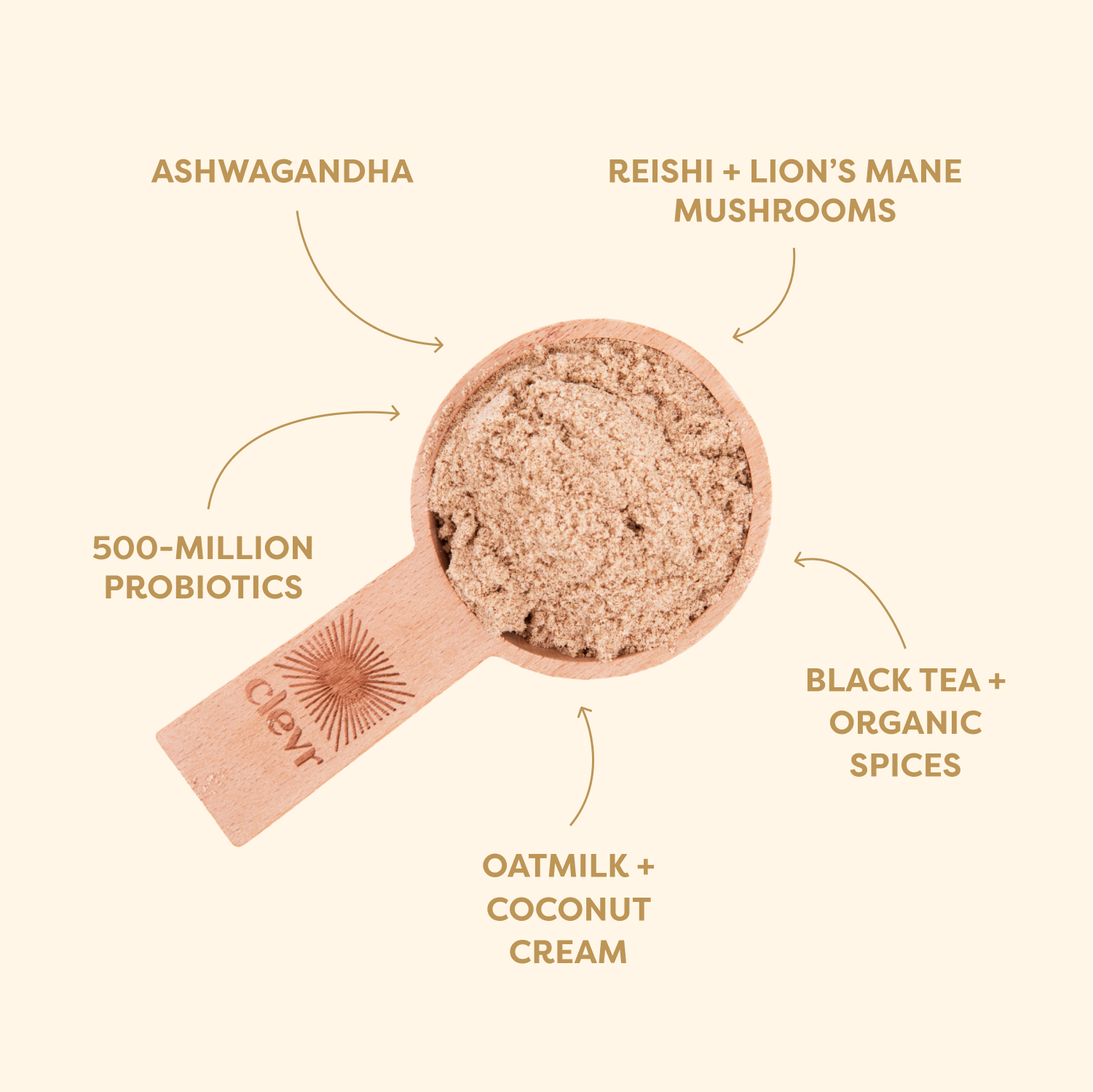 The perfect Chai Latte does exist! A cozy, barista-style chai, upgraded with adaptogens, mushrooms and probiotics to help manage stress and energize from the inside out. + Black tea & 7 whole-ground, organic spices + Decadent oat milk & coconut cream + Reishi, Lion's Mane, Ashwagandha + Just add water for a barista latte, anywhere Sip anytime you need a grounded energy boost.